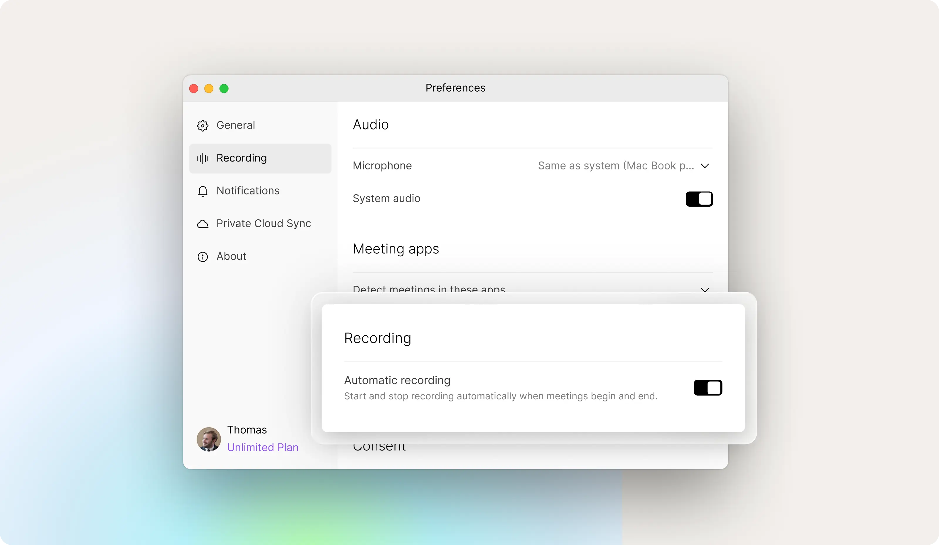 Control exactly when Plaud Desktop records. Set it on automatic recording, get a prompt when meetings start, or start recording manually. This gives you flexiblity and control that fits your workflow and protects your privacy.