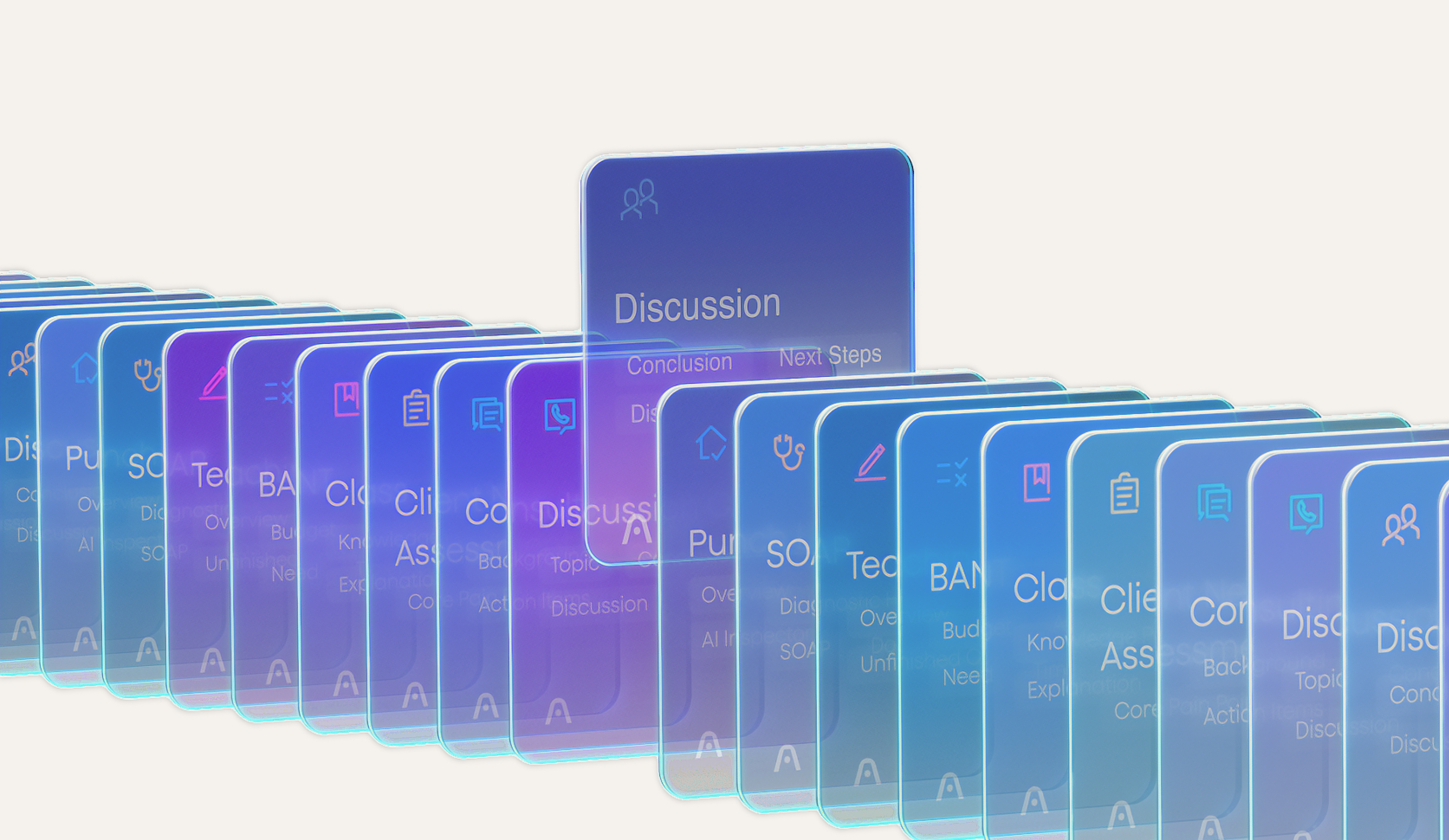 Auto-generation of transcripts and summaries using AI-selected languages, templates, and LLMs.